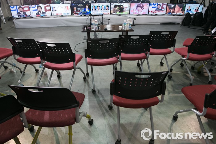 (서울=포커스뉴스) 제20대 국회의원 선거날인 13일 오후 서울 여의도 새누리당사 내 선거상황실 자리가 텅 빈채, 개표방송이 중계되고 있다.