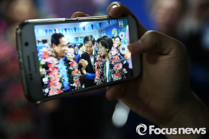 (서울=포커스뉴스) 14일 오전 서울 송파구에 위치한 선거사무실에서 남인순 더불어민주당 송파구병 후보가 지지자들에게 축하를 받고 있다.