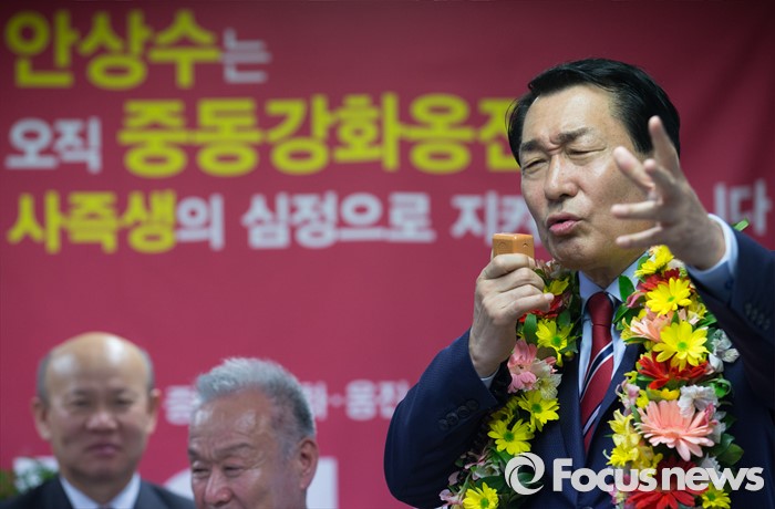 (인천=포커스뉴스) 제20대 국회의원선거 인천 중구동구강화군옹진군 선거구에서 당선이 확실시 된 안상수 무소속 후보가 13일 오후 인천 중구 선거사무소에서 지지자들에게 당선 소감을 밝히고 있다.