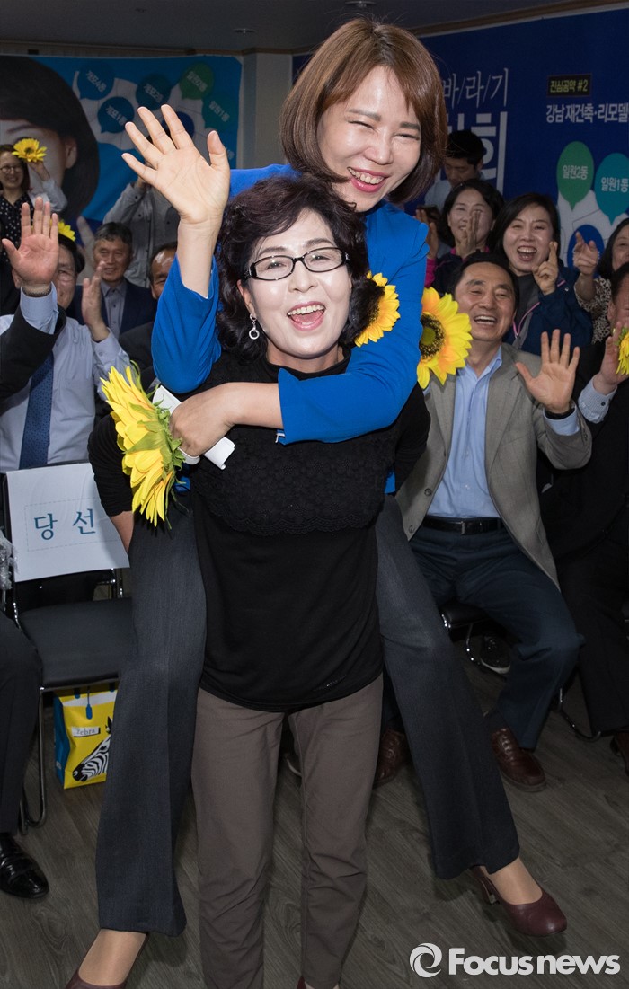 (서울=포커스뉴스) 2016 제20대 국회의원선거날인 13일 오후 서울 강남구 로즈데일빌딩에 위치한 전현희 더불어민주당 강남을 후보 선거사무소에서 전 후보가 당선이 유력해지자 지지자들과 기뻐하고 있다.