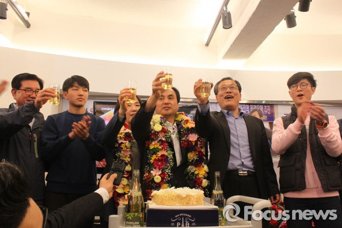 서울 동대문구갑 선거구 안규백 더불어민주당 후보 사무실에서 샴페인이 터졌다.