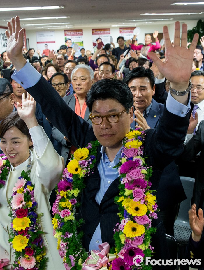 (부산=포커스뉴스) 제20대 국회의원선거에서 당선이 확실시된 장제원 무소속 부산 사상구 후보가 14일 오전 부산 사상구 선거사무소에서 두 손을 들어 기뻐하고 있다.