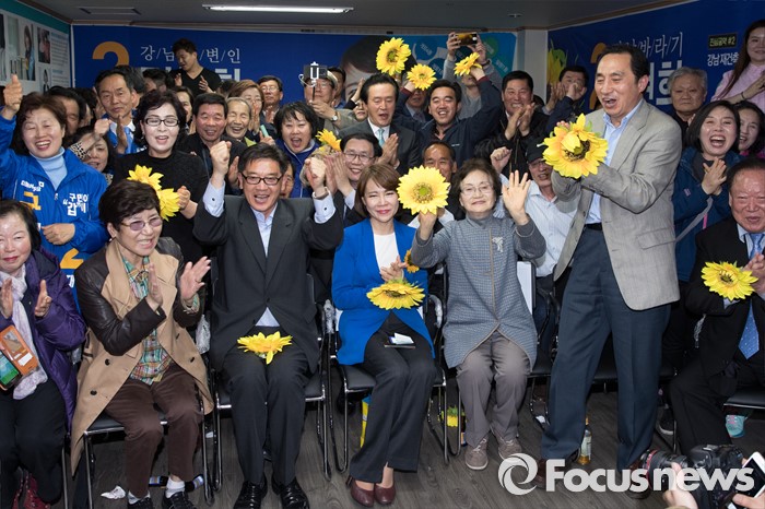 (서울=포커스뉴스) 전현희 더불어민주당 강남을 후보의 당선이 유력시된 14일 새벽 서울 강남구 로즈데일빌딩에 위치한 선거사무소에서 전 후보와 지지자들이 기뻐하고 있다.