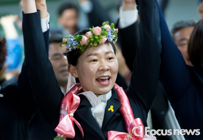 2위는 43.3%를 기록한 더민주당 이용섭 후보가 차지했고, 3위 정의당 문정은 후보는 2.4%를 기록했다.권은희 국민의당 광주 광산구을 후보가 13일 오후 광주 광산구 수완동 선거사무실에서 당선이 유력해지자 지지자들과 환호하고 있다. 2016.04.13 김인철 기자