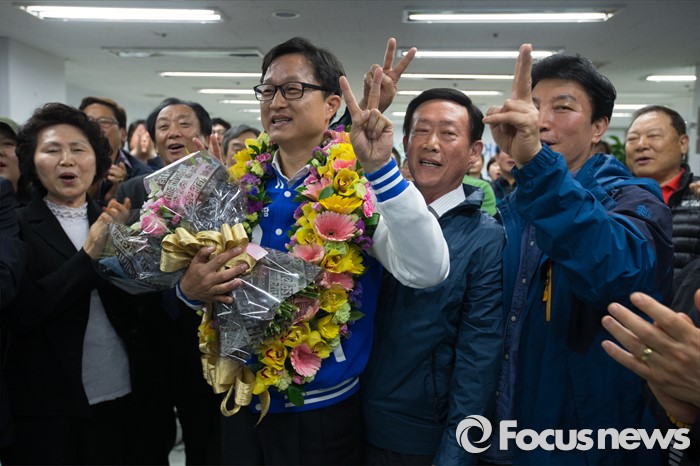 (서울=포커스뉴스) 강병원 더불어민주당 은평을 후보가 14일 오전 서울 은평구 선거사무소에서 당선이 유력시되자 지지자들과 함께 기쁨을 나누고 있다.