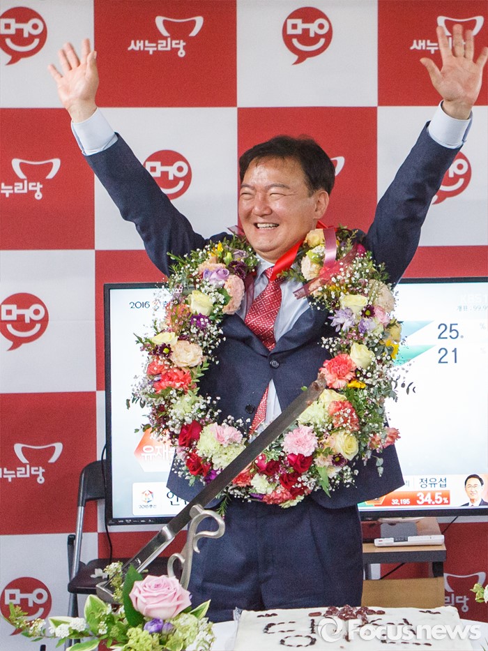 (서울=포커스뉴스) 20대 총선에서 당선이 확정된 민경욱 새누리당 인천 연수을 후보가 14일 인천 연수구 선거캠프에서 자축하고 있다. <사진제공=민경욱 후보 선거사무소>