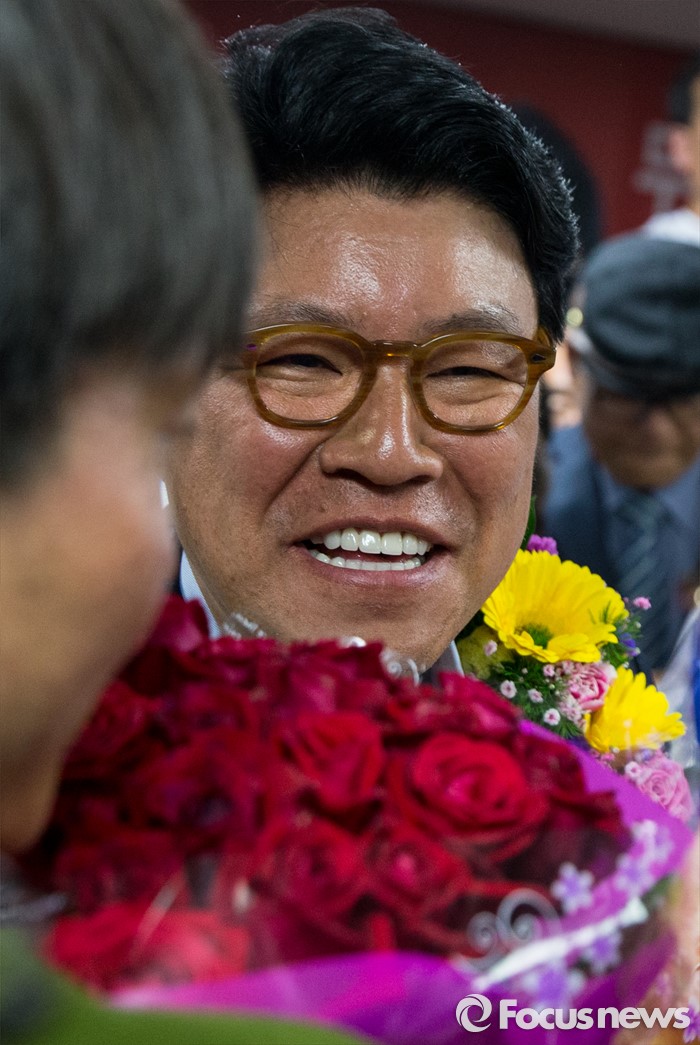 2위는 득표율 35.9%로 더민주 배재정 후보가 차지했다.(부산=포커스뉴스) 제20대 국회의원선거에서 당선이 확실시된 장제원 무소속 부산 사상구 후보가 14일 오전 부산 사상구 선거사무소에서 밝게 웃고 있다. 2016.04.14 양지웅 기자