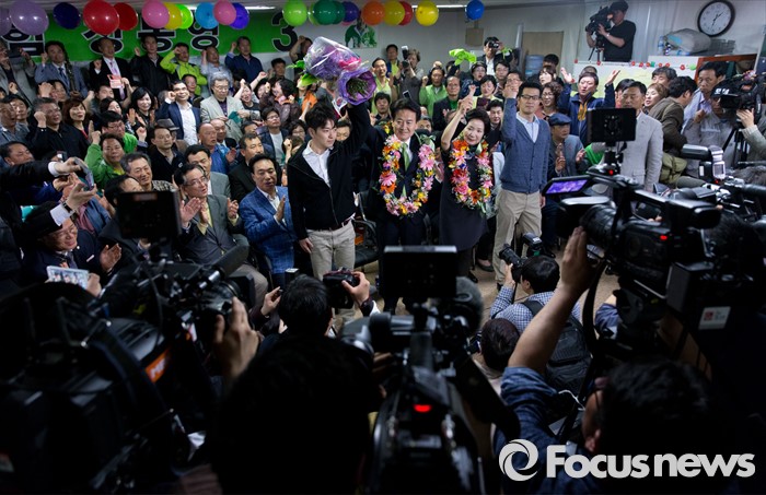 (전주=포커스뉴스) 정동영 국민의당 전주시병 당선인이 14일 오전 전북 전주시 금암동 선거사무소에서 당선이 확정되자 지지자들과 환호하고 있다.