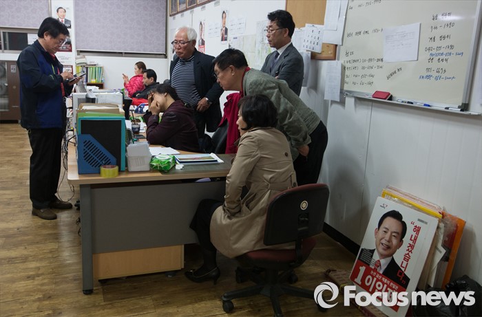 (논산=포커스뉴스) 14일 제20대 충남 논산계룡금산 국회의원 선거에서 낙선한 이인제 새누리당 후보 선거사무소에서 지지자들이 경직된 모습으로 개표결과를 지켜보고 있다.