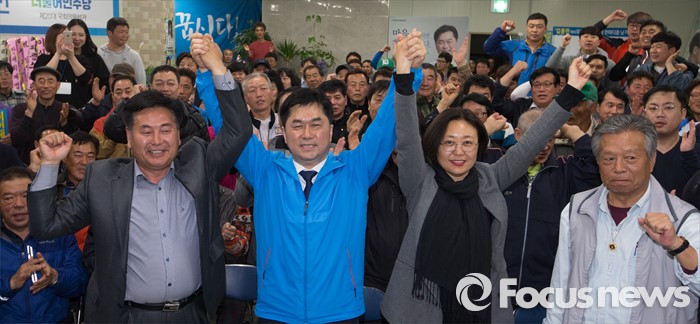(논산=포커스뉴스) 제20대 충남 논산계룡금산 국회의원에 당선된 김종민 더불어민주당 당선인이 14일 논산 선거사무실에서 환호하고 있다.