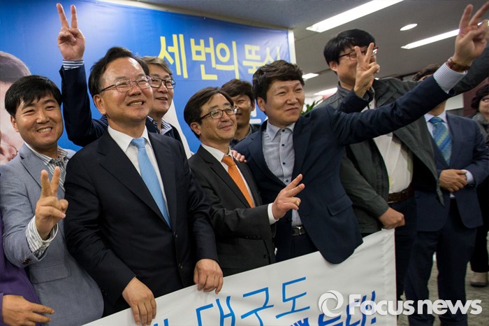 2위는 37.7%(4만1829표)를 기록한 새누리당 김문수 후보가 차지했다.제20대 국회의원선거 대구 수성구갑 선거구에서 당선이 확실시된 더불어민주당 김부겸 후보가 13일 오후 대구 수성구 선거사무소에서 지지자들과 '이제 대구도 사람보고 뽑는다'는 구호를 외치며 사진촬영을 하고 있다. 2016.04.14 강진형 기자