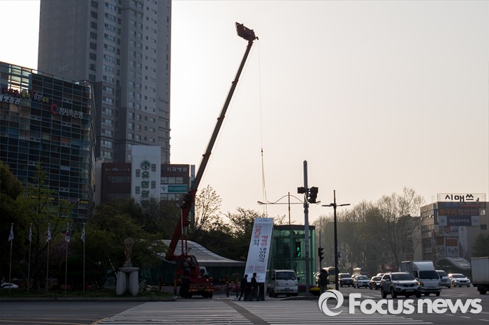 (대구=포커스뉴스) 14일 오전 대구 수성구 범어네거리에서 인부들이 선거관리위원회가 설치한 투표독려 구조물을 해체 하고 있다.