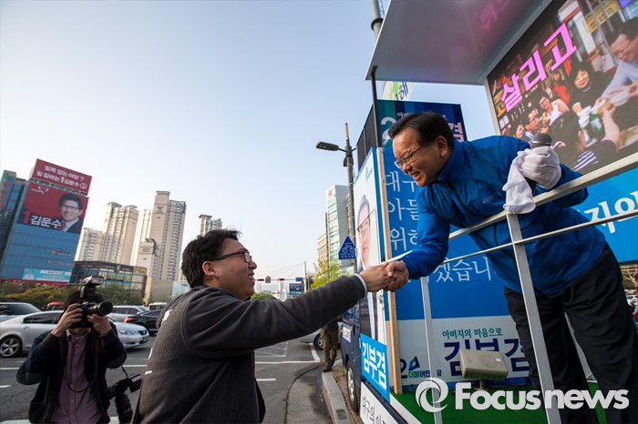 (대구=포커스뉴스) 제20대 국회의원선거 대구 수성구갑 선거구에서 당선된 더불어민주당 김부겸 당선자가 14일 오전 대구 수성구 범어네거리에서 당선 인사를 하고 있다.