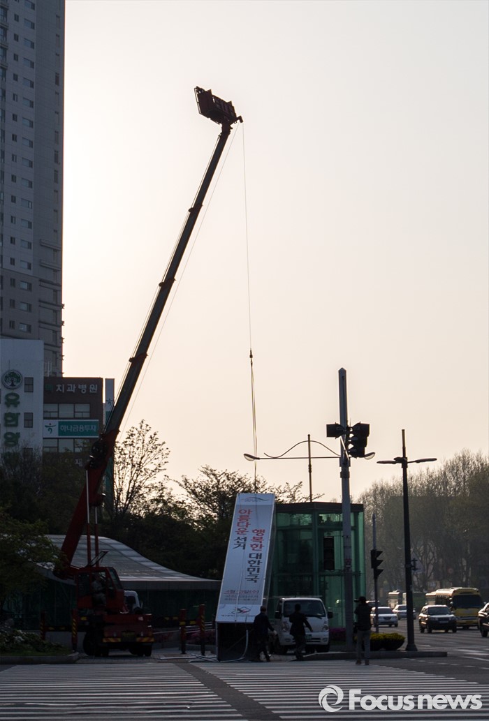 (대구=포커스뉴스) 14일 오전 대구 수성구 범어네거리에서 인부들이 선거관리위원회가 설치한 투표독려 구조물을 해체 하고 있다.