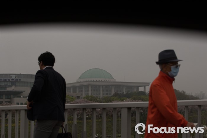 (서울=포커스뉴스) 제 20대 국회의원 선거가 끝난 14일 오전 서울 마포구 마포대교에서 안개에 둘러싸인 국회가 보이고 있다.