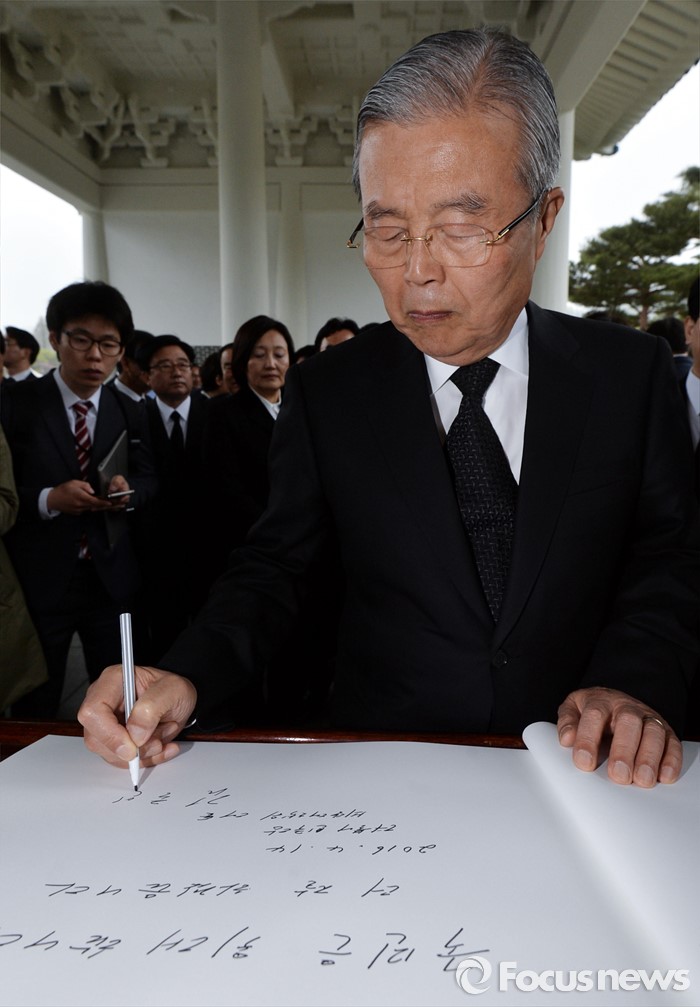 (서울=포커스뉴스) 김종인 더불어민주당 비대위 대표가 14일 오전 동작구 국립서울현충원에서 현충탑 참배를 마친 뒤 방명록을 작성하고 있다.