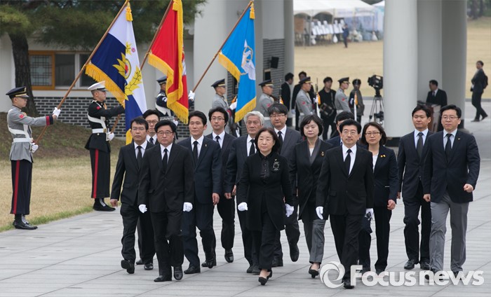 (서울=포커스뉴스) 심상정 정의당 상임대표와 20대 총선 비례대표 당선인들이 14일 오전 동작구 국립서울현충원에서 현충탑 참배를 위해 이동하고 있다.