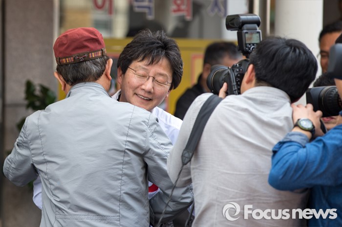 (대구=포커스뉴스) 제20대 국회의원선거 대구 동구을 지역구에서 당선된 무소속 유승민 당선자가 14일 오전 대구 동구 불로시장에 도착해 주민들에게 당선인사 하고 있다.