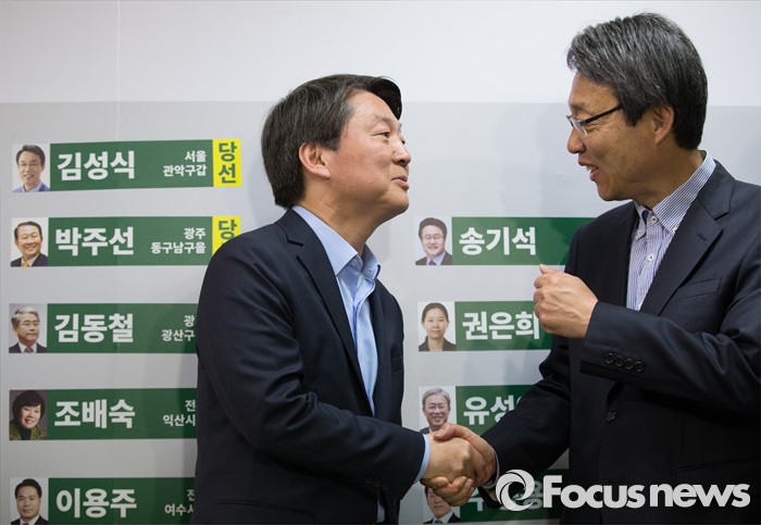 (서울=포커스뉴스) 안철수 국민의당 상임공동대표가 14일 오전 마포구 당사에서 선거 상황판에 당선된 김성식 후보의 이름표를 붙인 후 김 후보와 악수를 나누며 축하해주고 있다.