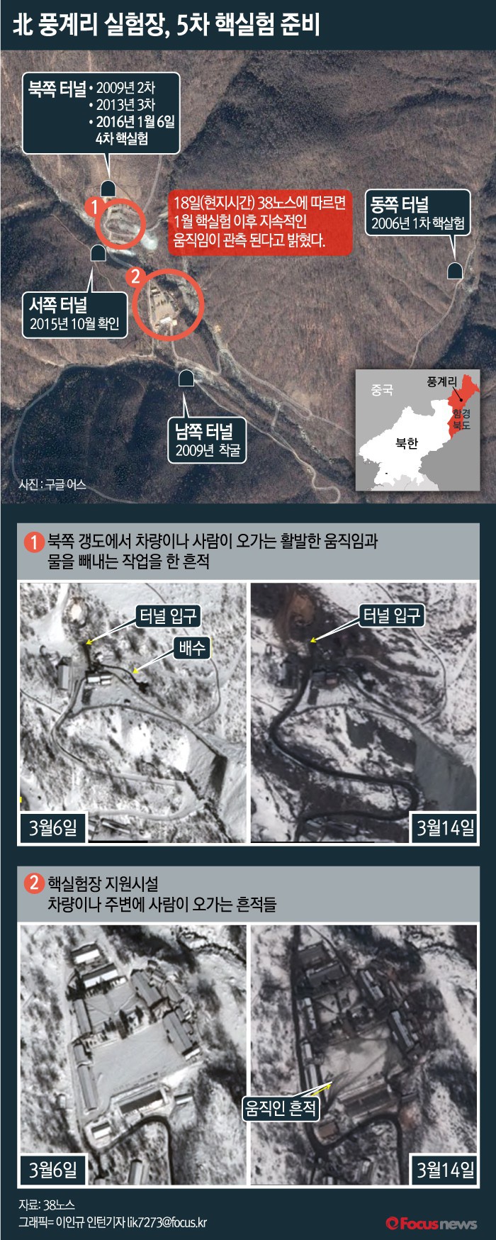 이 매체는 지난 3월에도 북한이 핵실험 준비를 마무리했다고 보도했다. 이 외에도 미국 CNN 방송 등 외신은 미국 정부 관리의 말을 인용해 북한의 탄도 미사일 발사 가능성을 제기했다.(서울=포커스뉴스) 18일(현지시간) 미국 존스홉킨스대 한미연구소가 운영하는 북한 전문 사이트 38노스는 풍계리 실험장의 "3월 위성사진을 보면 지난 1월 핵실험을 진행한 북쪽 갱도에서 활발한 움직임과 더불어 물을 빼내는 작업을 한 흔적이 보인다"며 추가 핵실험이 진행될 가능성이 있다는 분석이 나왔다. 2016.03.21 이인규 인턴기자