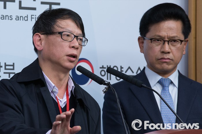 (세종=포커스뉴스) 왕웨이핑 세월호 인양 현장 총감독이 14일 오전 세종시 정부세종청사 해양수산부 기자실에서 세월호 인양 작업에 대해 설명하고 있다.
