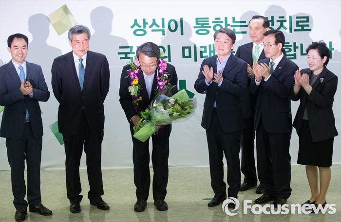 (서울=포커스뉴스) 안철수 국민의당 상임공동대표(왼쪽 네번째)및 지도부가 14일 오전 마포구 당사에서 김성식 관악구갑 국회의원 당선자(왼쪽 세번째)를 축하하고 있다.