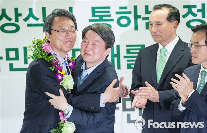 (서울=포커스뉴스) 안철수 국민의당 상임공동대표가14일 오전 마포구 당사에서 김성식 관악구갑 국회의원 당선자에게 꽃목걸이를 걸고 안아주고 있다.