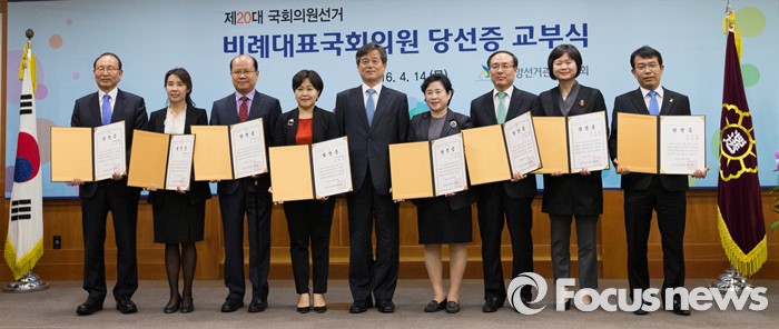 (과천=포커스뉴스) 14일 오후 경기도 과천 중앙선거관리위원회 회의실에서 열린 제20대 국회의원선거 비례대표국회의원 당선증 교부식에 참석한 이인복 중앙선거관리위원회 위원장과 당선인들이 기념촬영을 하고 있다. 왼쪽부터 더불어민주당 최운열, 박경미, 새누리당 이종명, 송희경 당선인, 이 위원장, 국민의당 신용현, 오세정, 정의당 이정미, 김종대 당선인.