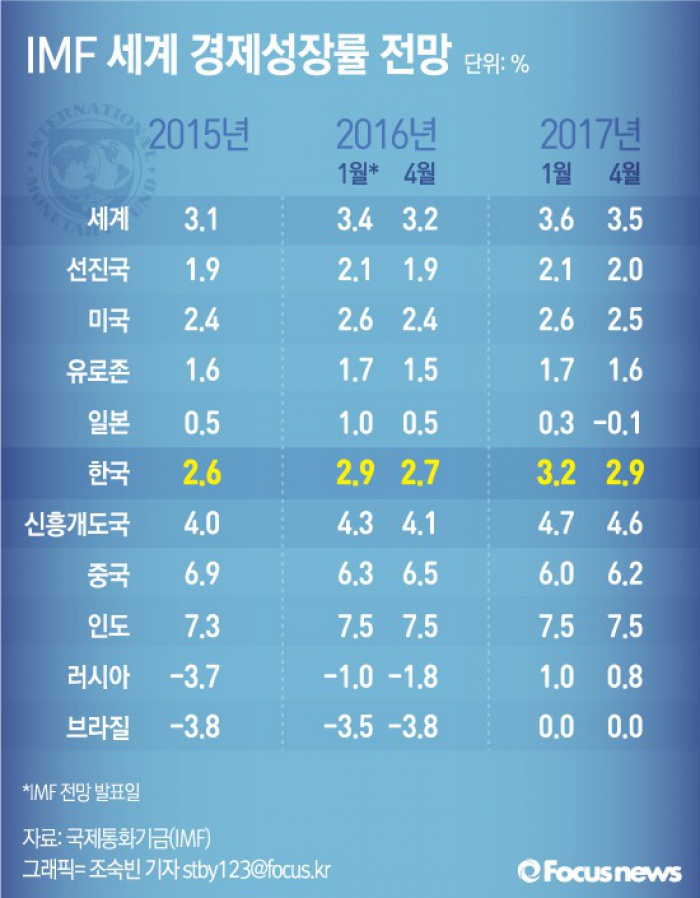 국제통화기금(IMF)도 13일 국내 경제성장률 전망치를 종전 2.9%에서 2.7%로 내렸다. IMF는 한국의 주요 무역 상대국인 중국의 수입수요 둔화를 주된 하향 배경으로 꼽았다.