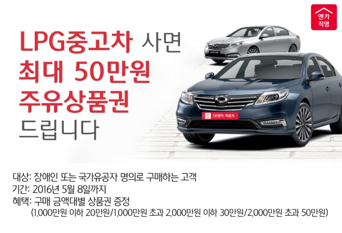 (서울=포커스뉴스) SK주식회사 엔카는 국가유공자와 장애인을 대상으로 LPG 중고차를 구매하면 최대 50만원의 주유상품권을 제공하는 이벤트를 다음달 8일까지 진행한다고 14일 밝혔다.
