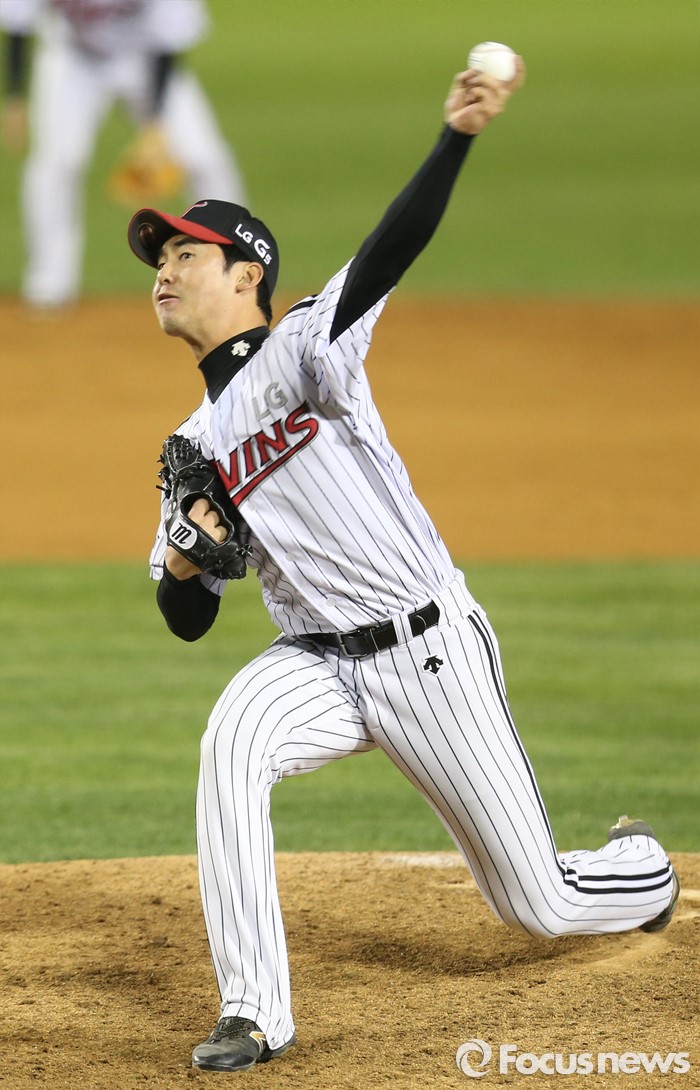 (서울=포커스뉴스) 14일 서울 잠실구장에서 열린 2016 프로야구 롯데-LG 경기에서 LG 투수 진해수가 8회 마운드에 올라 투구하고 있다.