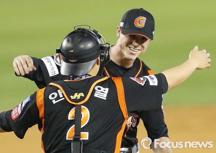 (서울=포커스뉴스) 14일 서울 잠실구장에서 열린 2016 프로야구 롯데-LG 경기에서 롯데 투수 레일리가 10탈삼진 무사사구 완봉승 거두고 포수 안중열과 포옹하고 있다.