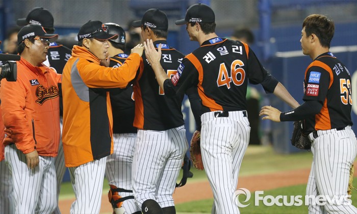 (서울=포커스뉴스) 14일 서울 잠실구장에서 열린 2016 프로야구 롯데-LG 경기에서 롯데 투수 레일리가 10탈삼진 무사사구 완봉승 거두고 조원우 감독과 하이파이브하고 있다.