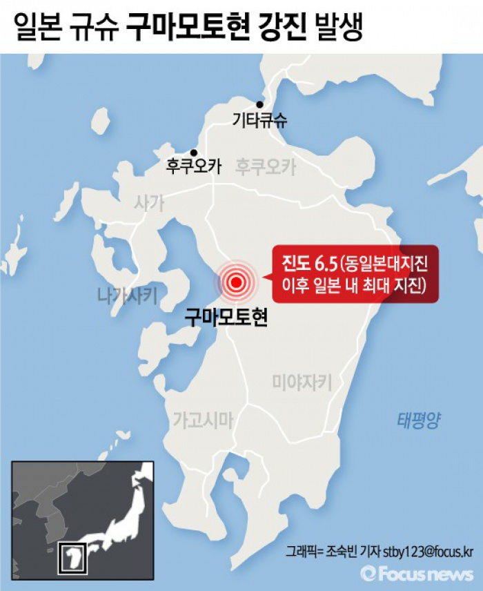 (서울=포커스뉴스) 14일 오후 9시 26분쯤 일본 규슈 구마모토현에서 진도 6.5 지진이 발생했다. 이번지진은 2011년 3월 발생한 동일본대지진 이후 일본에서 발생한 최대 지진이다.