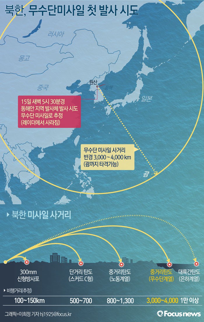 (서울=포커스뉴스) 합동참모본부에 따르면 15일 새벽 북한은 동해안지역에서 미사일 발사를 시도한 것으로 보이며 실패한 것으로 추정된다고 밝혔다.이날 북한이 발사를 시도한 미사일은 사정거리가 30,00km정도인 무수단(BM-25) 중거리 탄도미사일(IRBM)일 것으로 알려졌다.