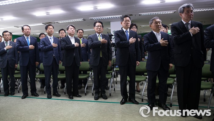 (서울=포커스뉴스) 안철수·천정배 상임공동대표 등 당지도부와 당선자들이 15일 오전 서울 마포구 당사에서 열린 국민의당 당선자 대회 및 선거대책위원회 해단식에서 국기에 대한 경례를 하고 있다. 왼쪽 세번째부터 천 대표, 안 대표, 박지원 의원, 주승용 원내대표.