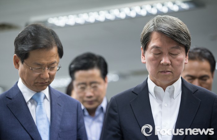 (서울=포커스뉴스) 안철수 상임공동대표(오른쪽)와 천정배 상임공동대표가 15일 오전 서울 마포구 당사에서 열린 국민의당 당선자 대회 및 선거대책위원회 해단식에서 묵념하고 있다.