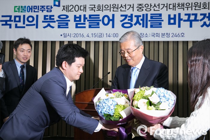 (서울=포커스뉴스) 김종인 더불어민주당 비대위 대표 겸 선대위원장이 15일 오후 서울 여의도 국회에서 열린 20대 총선 중앙선대위 해단식에 참석해 당직자들로부터 꽃다발을 전달받고 있다.