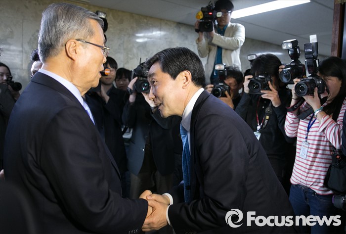 (서울=포커스뉴스) 김종인(왼쪽) 더불어민주당 비대위 대표 겸 선대위원장이 15일 오후 서울 여의도 국회에서 20대 총선 중앙선대위 해단식을 마친 뒤 이종걸 원내대표와 악수하고 있다.