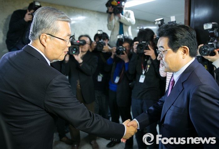 (서울=포커스뉴스) 김종인(왼쪽) 더불어민주당 비대위 대표 겸 선대위원장이 15일 오후 서울 여의도 국회에서 20대 총선 중앙선대위 해단식을 마친 뒤 전병헌 부위원장과 악수하고 있다.