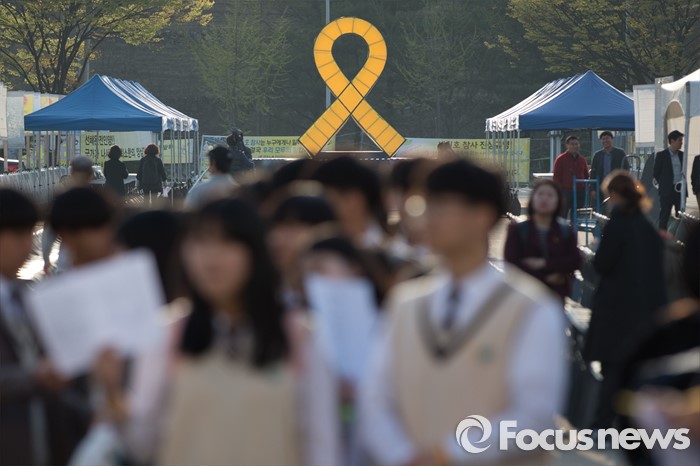 (안산=포커스뉴스) 세월호 참사 2주기를 하루 앞둔 15일 오후 경기도 안산시 단원구 세월호 정부합동분향소에서 안산시 고교학생회장단연합회 학생들이 추모제 행진을 위해 준비를 하고 있다.