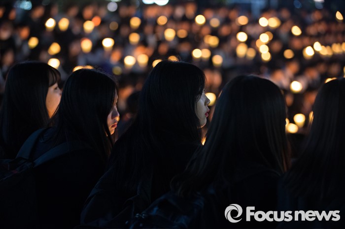 (안산=포커스뉴스) 세월호 참사 2주기를 하루 앞둔 15일 오후 경기도 안산시 단원구 안산문화광장에서 안산 지역 학생들이 추모제에 참석해 촛불을 들고 있다.