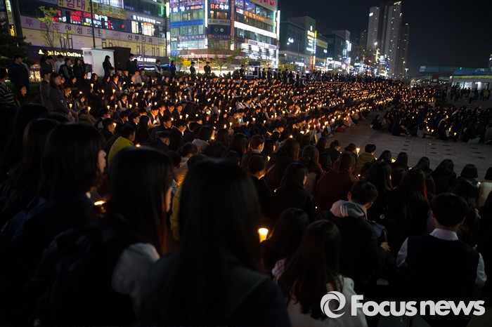 (안산=포커스뉴스) 세월호 참사 2주기를 하루 앞둔 15일 오후 경기도 안산시 단원구 안산문화광장에서 안산 지역 학생들이 추모제에 참석해 촛불을 들고 있다.
