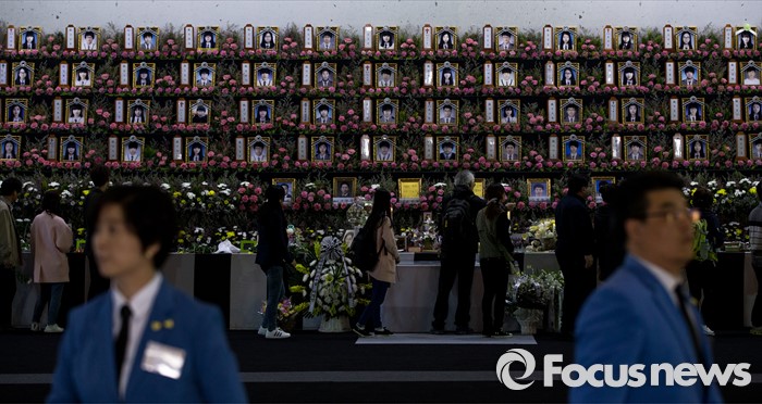 (안산=포커스뉴스) 세월호 참사 2주기인 16일 오전 경기도 안산시 단원구 화랑유원지에 마련된 합동분향소를 찾은 추모객들이 희생자들에게 헌화를 하고 있다.