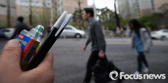 (서울=포커스뉴스) 17일 오전 서울 강남구 단국대학교부속고등학교에서 한 상인이 삼성그룹 공개채용시험 직무적성검사(GSAT)를 치르기 위한 취업준비생들에게 필기도구를 판매하고 있다.