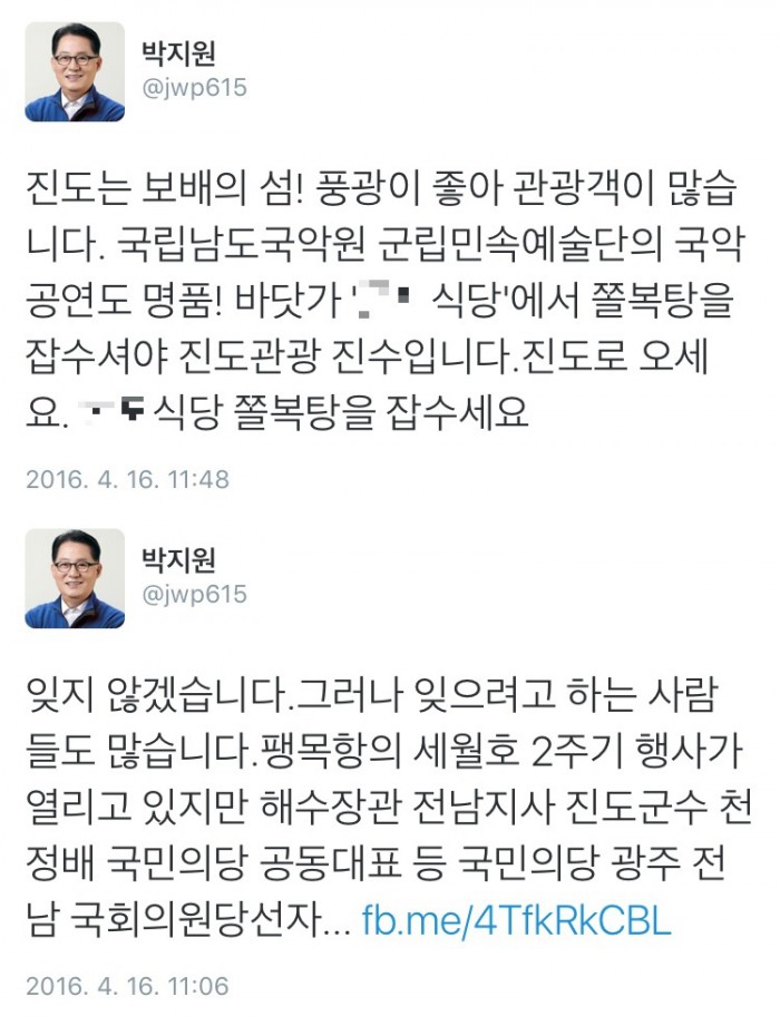 박지원 의원은 16일 오전 11시48분쯤 자신의 트위터에 "진도는 보배의 섬! 풍광이 좋아 관광객이 많습니다"라며 "국립남도국악원 군립민속예술단의 국악 공연도 명품! 바닷가 'OO식당'에서 쫄복탕을 잡수셔야 진도관광 진수입니다. 진도로 오세요. OO식당 쫄복탕을 잡수세요"라는 글을 남겼다.