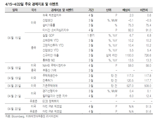 이번 주 주목할 이벤트와 경제지표는 ▲17일 카타르 도하 산유국 회의▲21일 ECB정책회의 등이 있다.