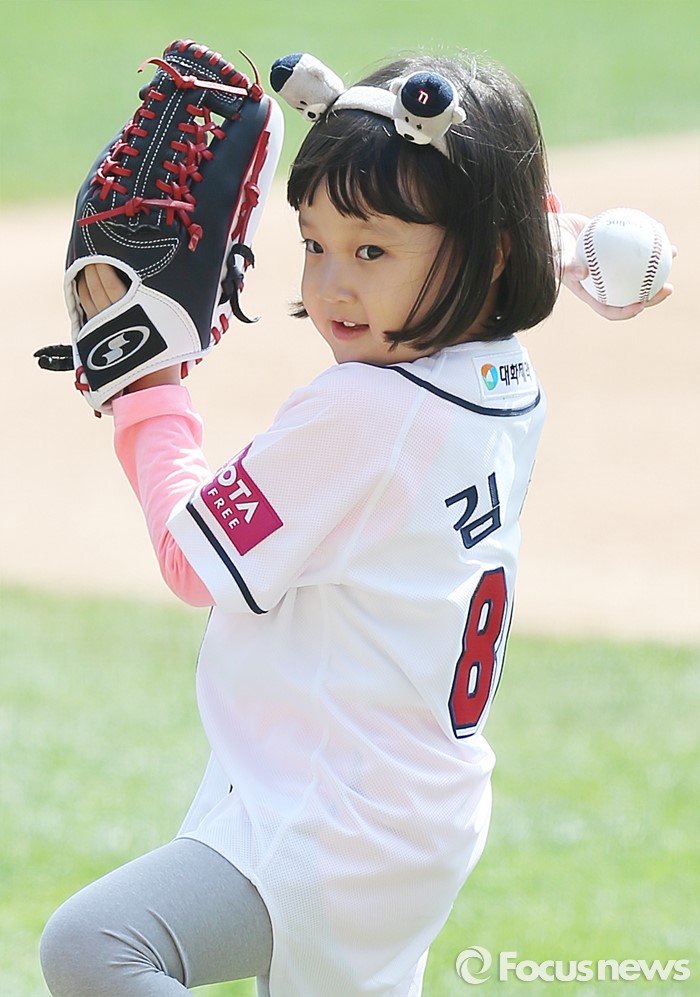 (서울=포커스뉴스) 17일 서울 잠실구장에서 열린 2016 프로야구 삼성-두산 경기에 앞서 TV 드라마 '응답하라 1988'에 '진주'로 출연했던 아역 탤런트 김설 어린이가 앙징맞은 모습으로 시구하고 있다.