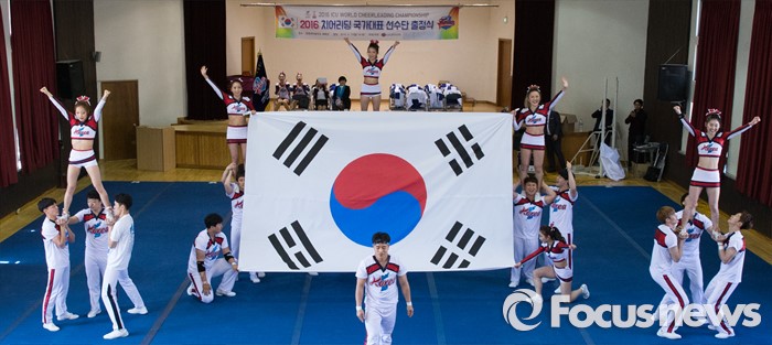 (서울=포커스뉴스) 17일 오후 서울 서대문구 동명여자중학교 체육관에서 열린 '2016 치어리딩 국가대표 선수단 출정식'에 참석한 선수들이 치어리딩 연기를 선보이고 있다.