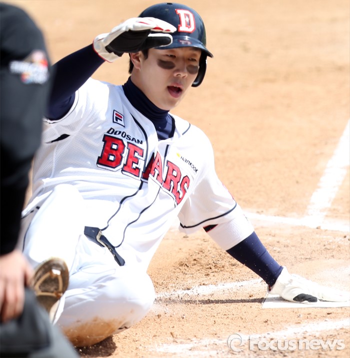 (서울=포커스뉴스) 17일 서울 잠실구장에서 열린 2016 프로야구 삼성-두산 경기 3회말 선두타자로 나와 좌중간 3루타를 친 두산 박건우가 김재호의 중견수 희생플라이때 홈으로 뛰어들어 세이프되고 있다.
